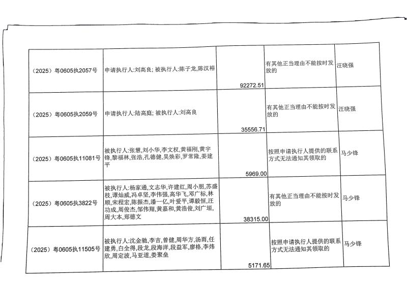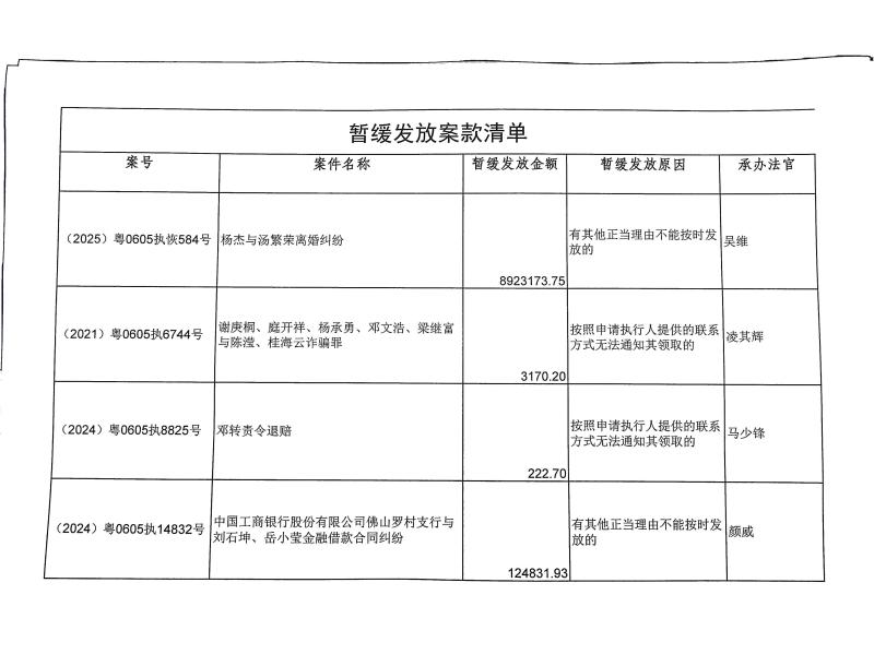 本院在执行(2024)粤0605执8825号等案件过程中,根据《最高人民法院关于执行款物管理工作的规定》,因案件执行需要,暂缓发放相关案款(详见《暂缓发放案款清单》),现予以公示,公示期为5天。