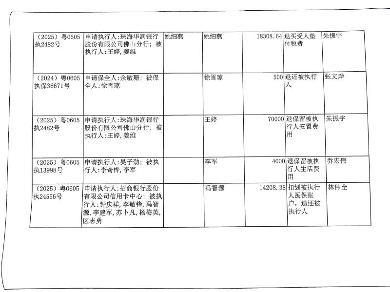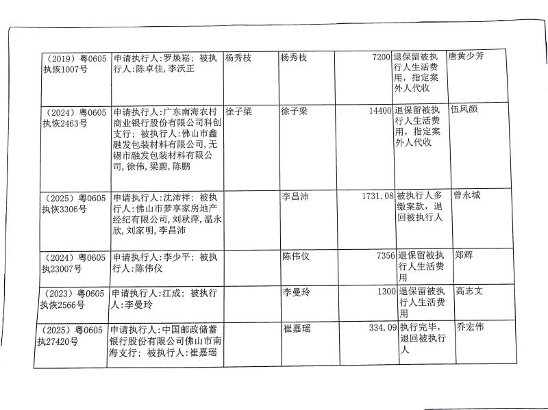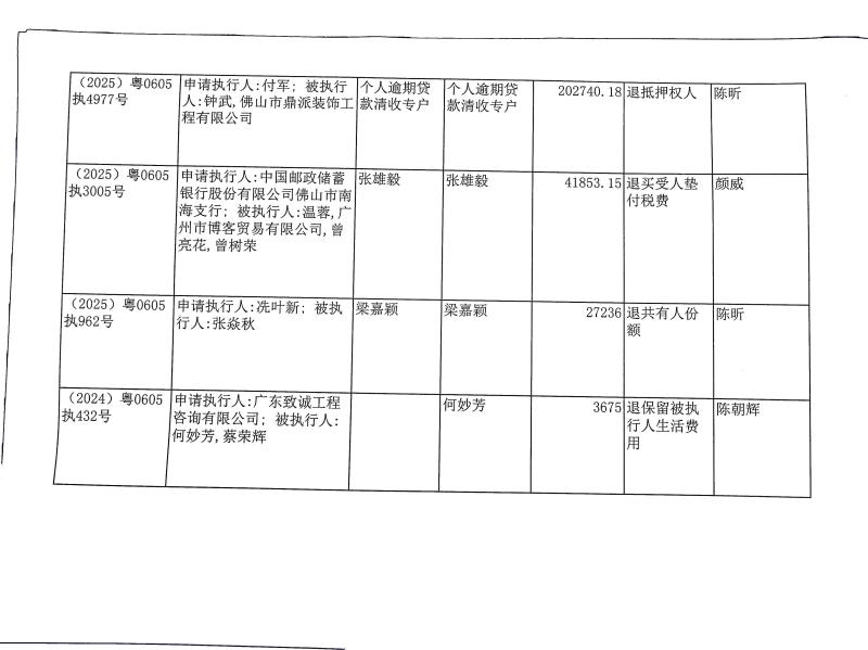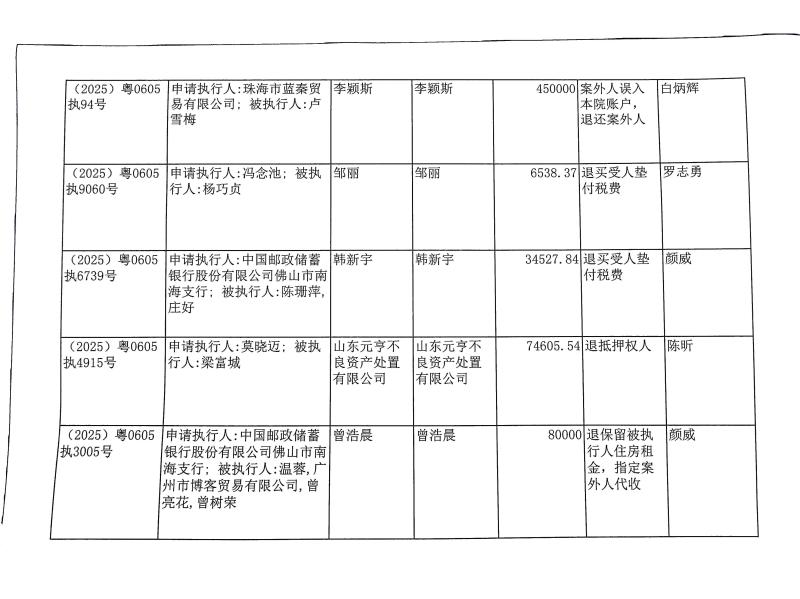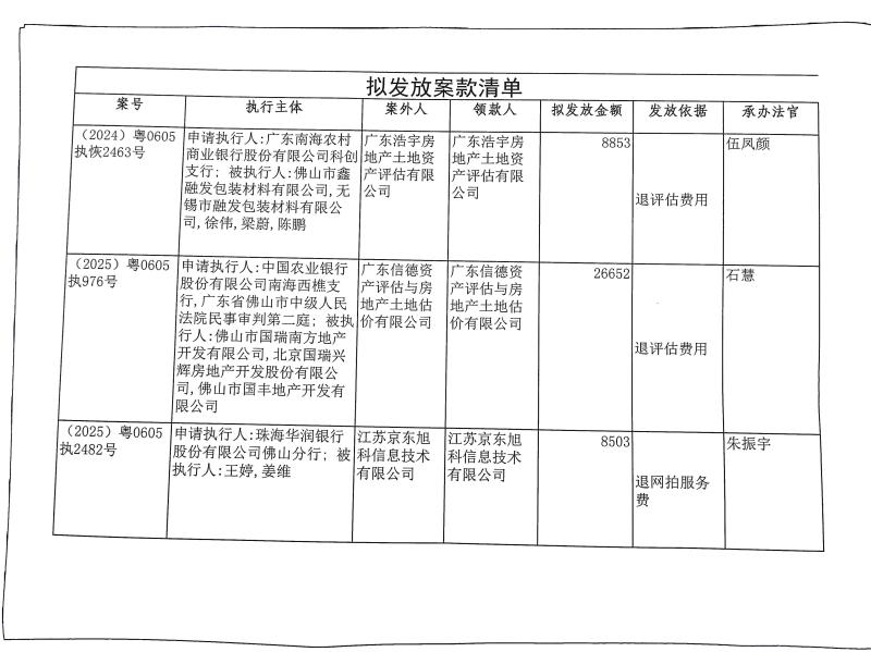 本院在执行(2025)粤0605执976号等案件过程中,根据《最高人民法院关于执行款物管理工作的规定》,拟向下列被执行人、案外人发放案款(详见《拟发放案款清单》),现予以公示,公示期为三天。