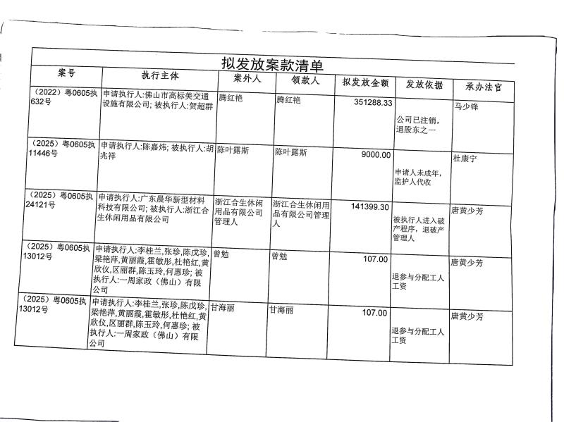 本院在执行(2025)粤0605执20010号等案件过程中,根据《最高人民法院关于执行款物管理工作的规定》,拟向下列被执行人、案外人发放案款(详见《拟发放案款清单》),现予以公示,公示期为三天。