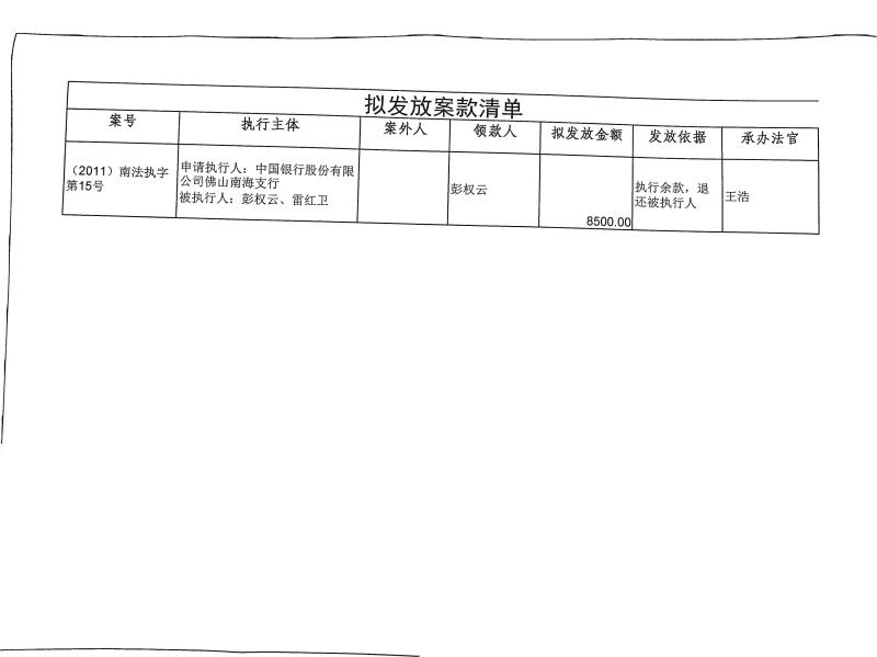 本院在执行(2011)南法执字第15号案件过程中,根据《最高人民法院关于执行款物管理工作的规定》,拟向下列被执行人、案外人发放案款(详见《拟发放案款清单》),现予以公示,公示期为三天。
