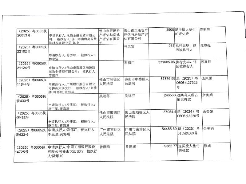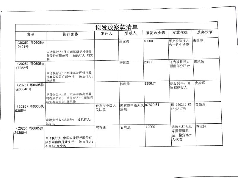 本院在执行(2015)粤0605执19491号等案件过程中,根据《最高人民法院关于执行款物管理工作的规定》,拟向下列被执行人、案外人发放案款(详见《拟发放案款清单》),现予以公示,公示期为三天。