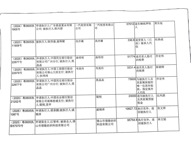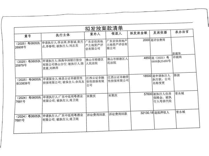本院在执行(2025)粤0605执26908号等案件过程中,根据《最高人民法院关于执行款物管理工作的规定》,拟向下列被执行人、案外人发放案款(详见《拟发放案款清单》),现予以公示,公示期为三天。