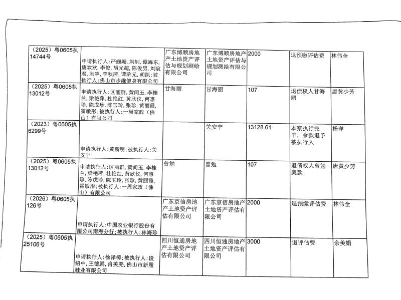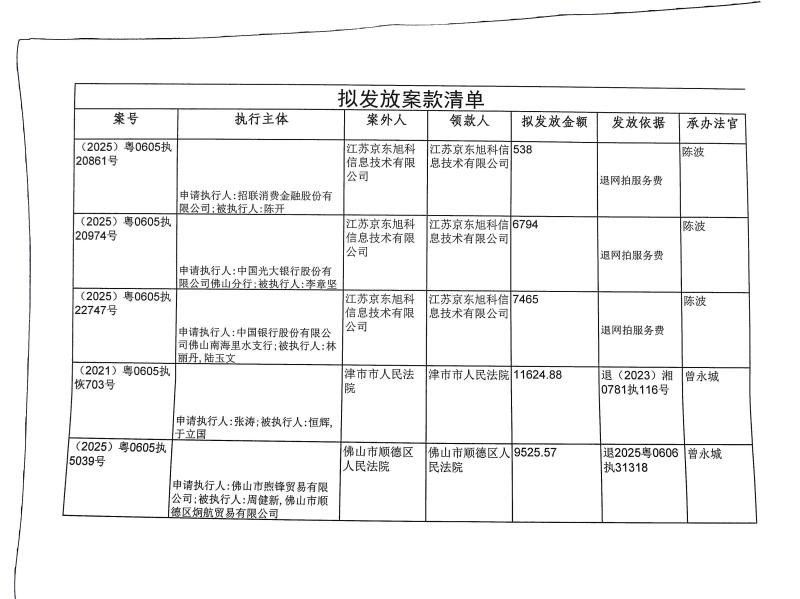 本院在执行(2025)粤0605执20861号等案件过程中,根据《最高人民法院关于执行款物管理工作的规定》,拟向下列被执行人、案外人发放案款(详见《拟发放案款清单》),现予以公示,公示期为三天。