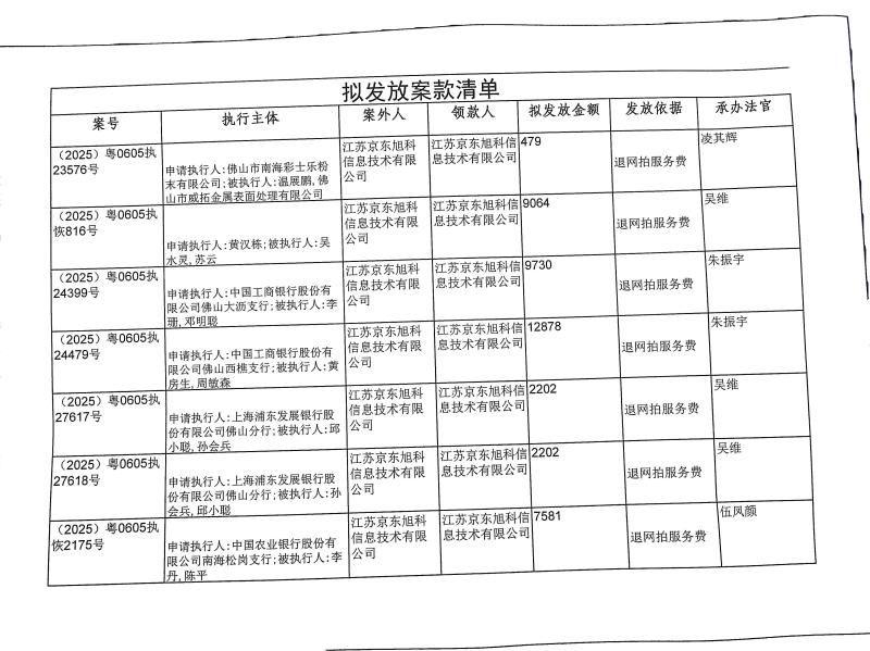 本院在执行(2025)粤0605执23576号等案件过程中,根据《最高人民法院关于执行款物管理工作的规定》,拟向下列被执行人、案外人发放案款(详见《拟发放案款清单》),现予以公示,公示期为三天。