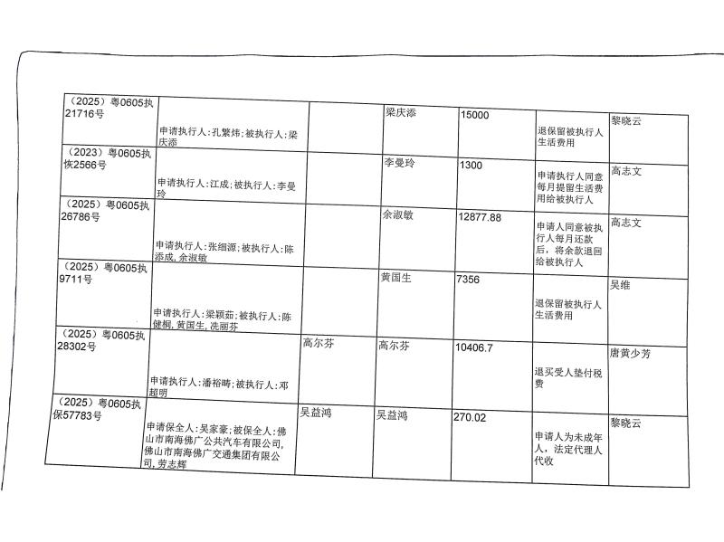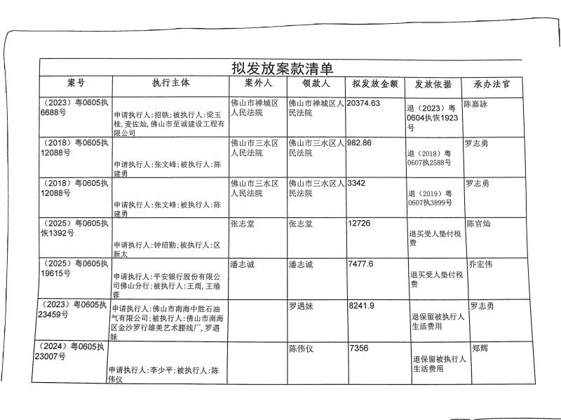 本院在执行(2023)粤0605执688号等案件过程中,根据《最高人民法院关于执行款物管理工作的规定》,拟向下列被执行人、案外人发放案款(详见《拟发放案款清单》),现予以公示,公示期为三天。